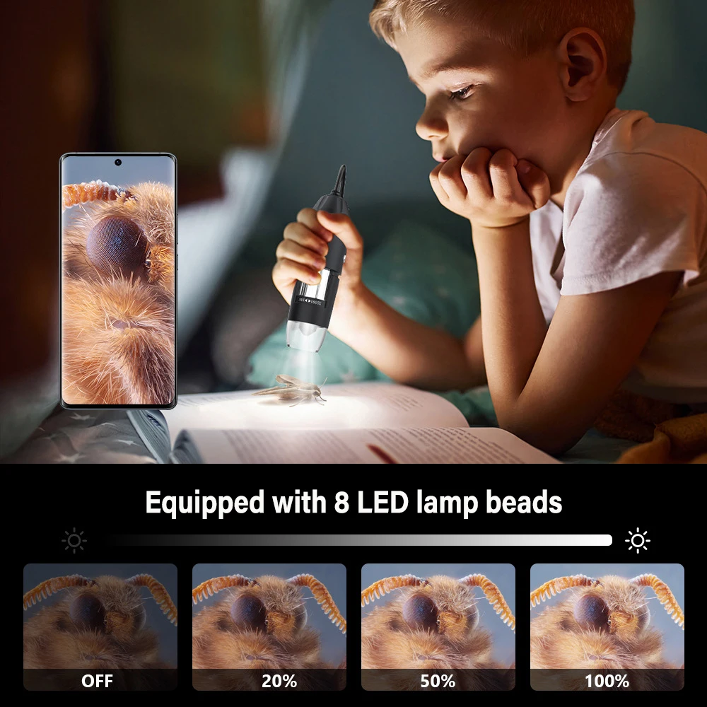 The microscope provides clear imaging suitable for checking circuit boards, phone components, textiles, watches and precision parts. It can also be used for learning, science demonstrations and close-up viewing of small details. Operation is simple: connect to your device, open the camera software and adjust focus manually to get a sharp view.