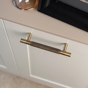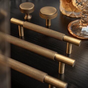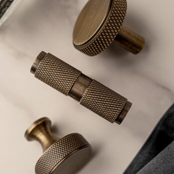 Antique brass cabinet handles and T bar knobs made from brass, designed for kitchen cupboards, wardrobes and drawers. The diamond-cut cross knurl pattern gives these handles a strong grip and a refined, modern look that works well in both classic and contemporary interiors.