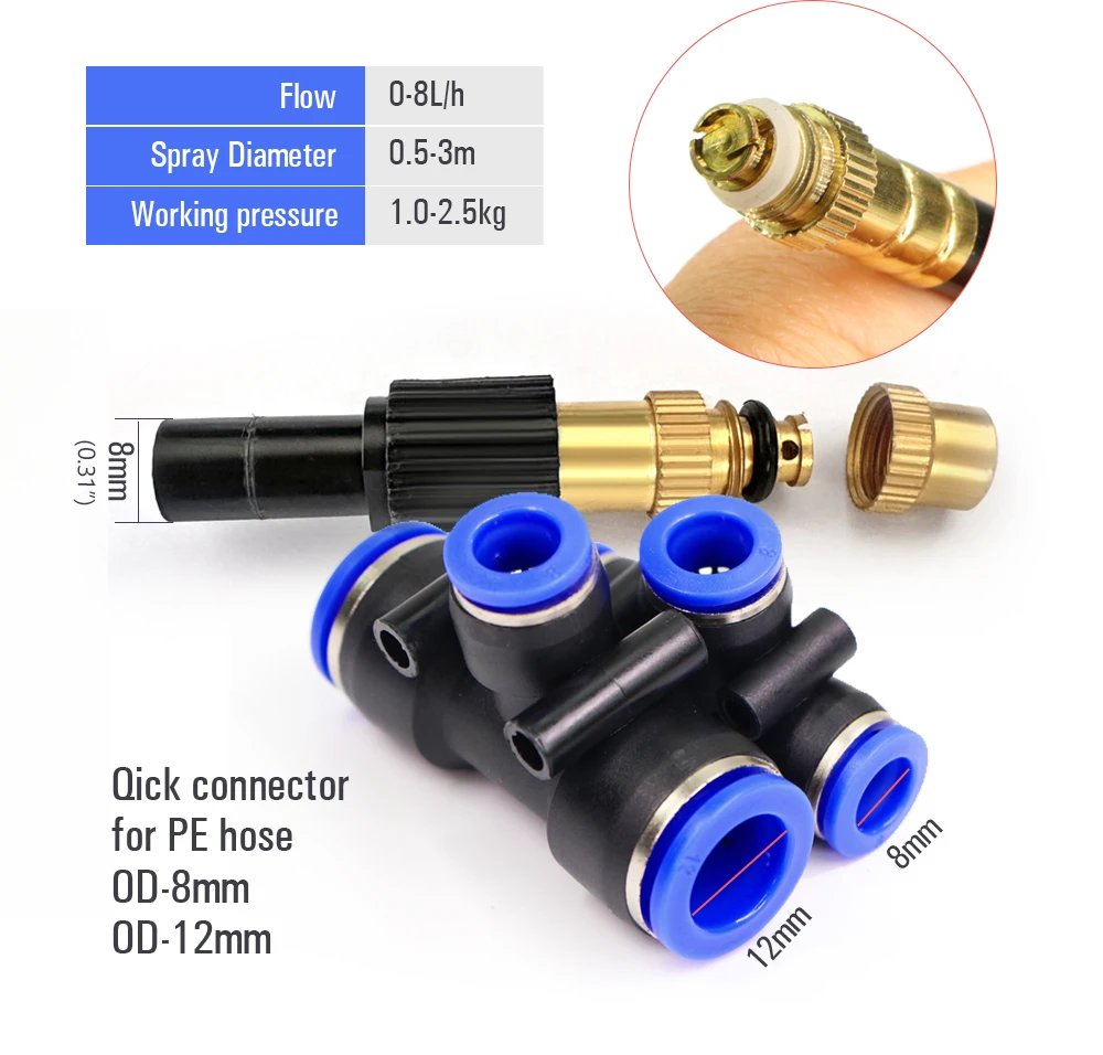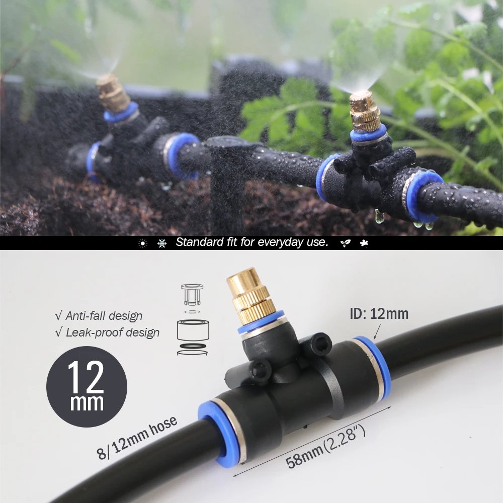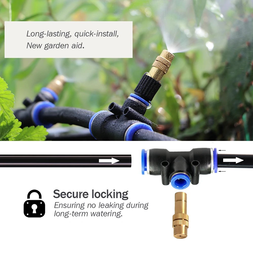 Brass micro sprinkler nozzles designed for fine mist watering and cooling in garden irrigation systems. These adjustable atomising nozzles connect directly to 8mm or 12mm PE hoses and provide even spray coverage for plants, lawns and greenhouse setups.