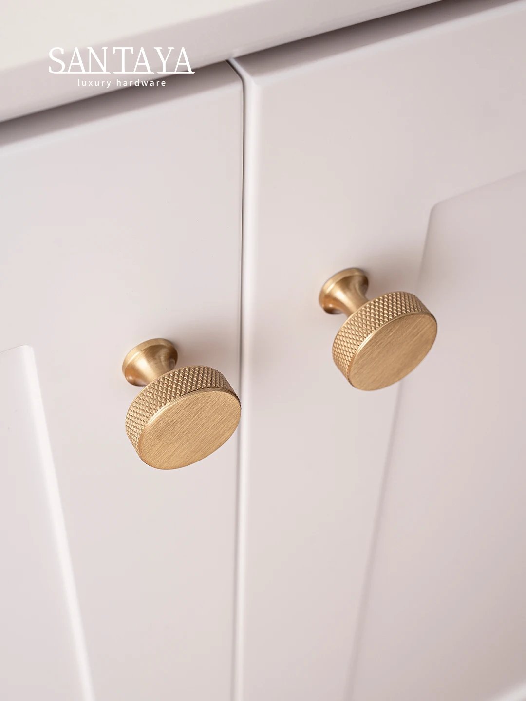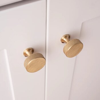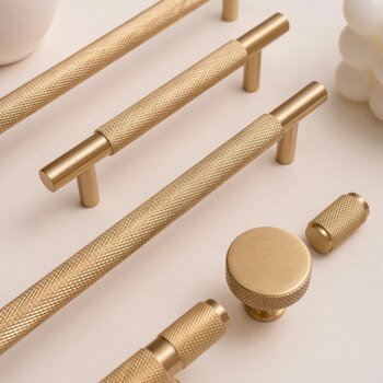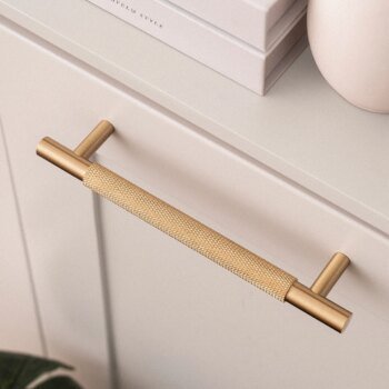 Brushed brass cabinet handles with a cross knurled texture, designed for kitchen cupboards, wardrobes, and drawers. Solid brass construction ensures durability, while the textured grip adds a modern industrial look and improved handling.