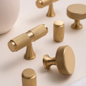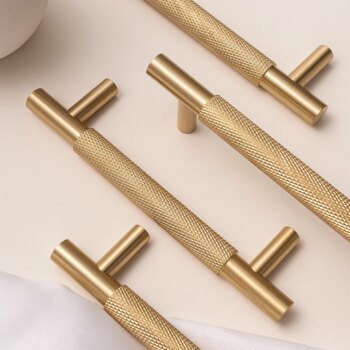 brushed brass cabinet handles, knurled drawer pulls, kitchen cupboard handles modern, wardrobe door handles brass, T bar cabinet handle brass, drawer knobs brass, furniture handles gold brass, industrial cabinet pulls