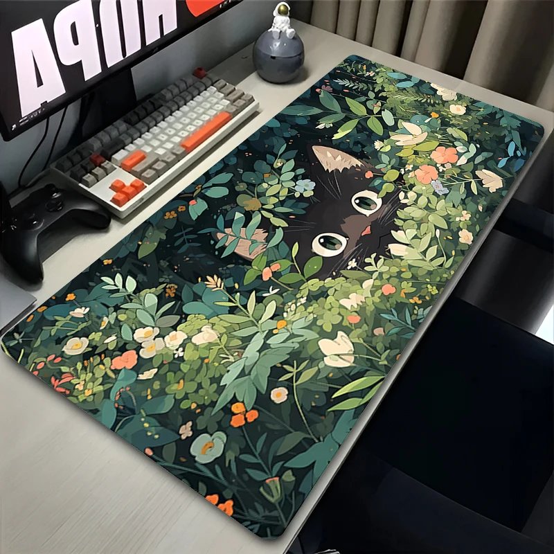 Black cat floral gaming mouse pad in XL and XXL sizes designed for full desk coverage and smooth mouse control. The detailed print with green plants and cat artwork adds character to your setup while providing a practical surface for gaming and office work.