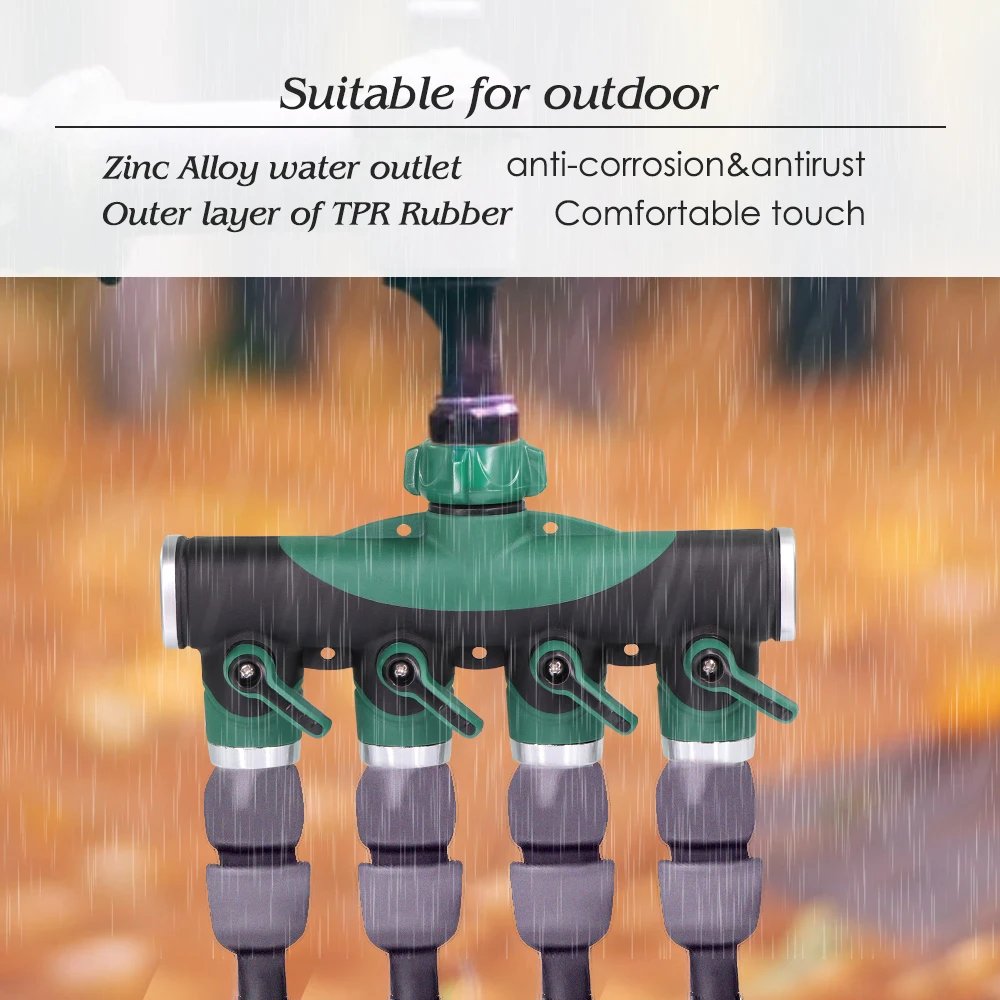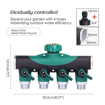 Heavy duty 4 way hose splitter designed to convert one outdoor tap into four independent water outlets. Ideal for garden irrigation, car washing and outdoor cleaning tasks where multiple hoses are required at the same time.