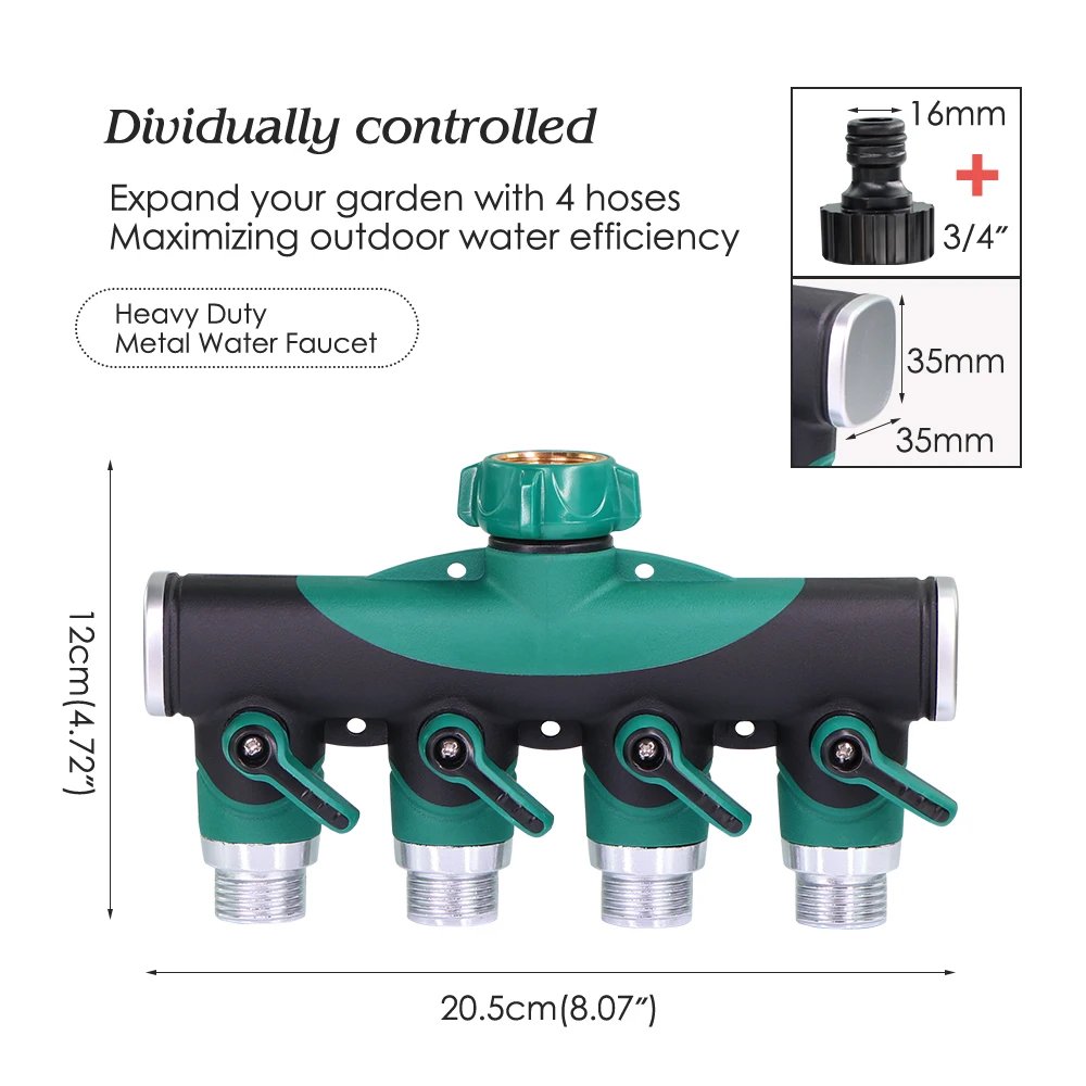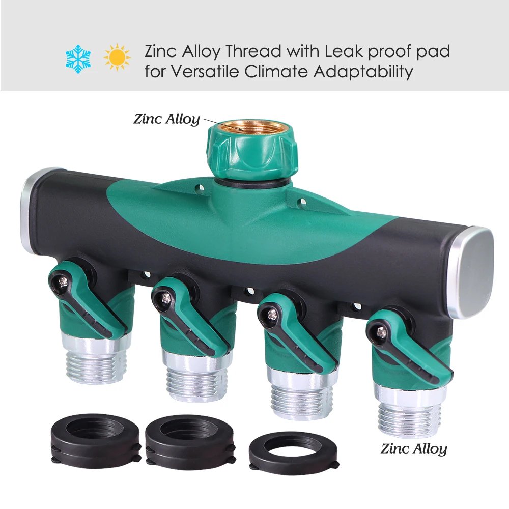 Heavy Duty Metal 4 Way Hose Splitter with Shut Off Valves