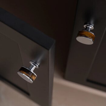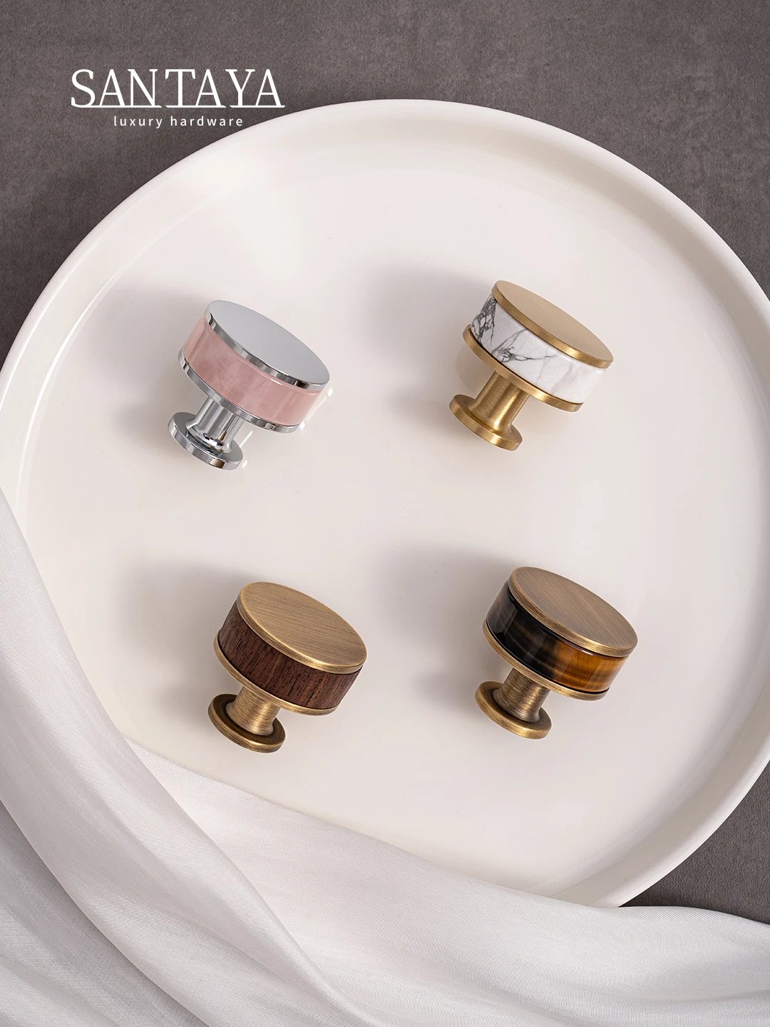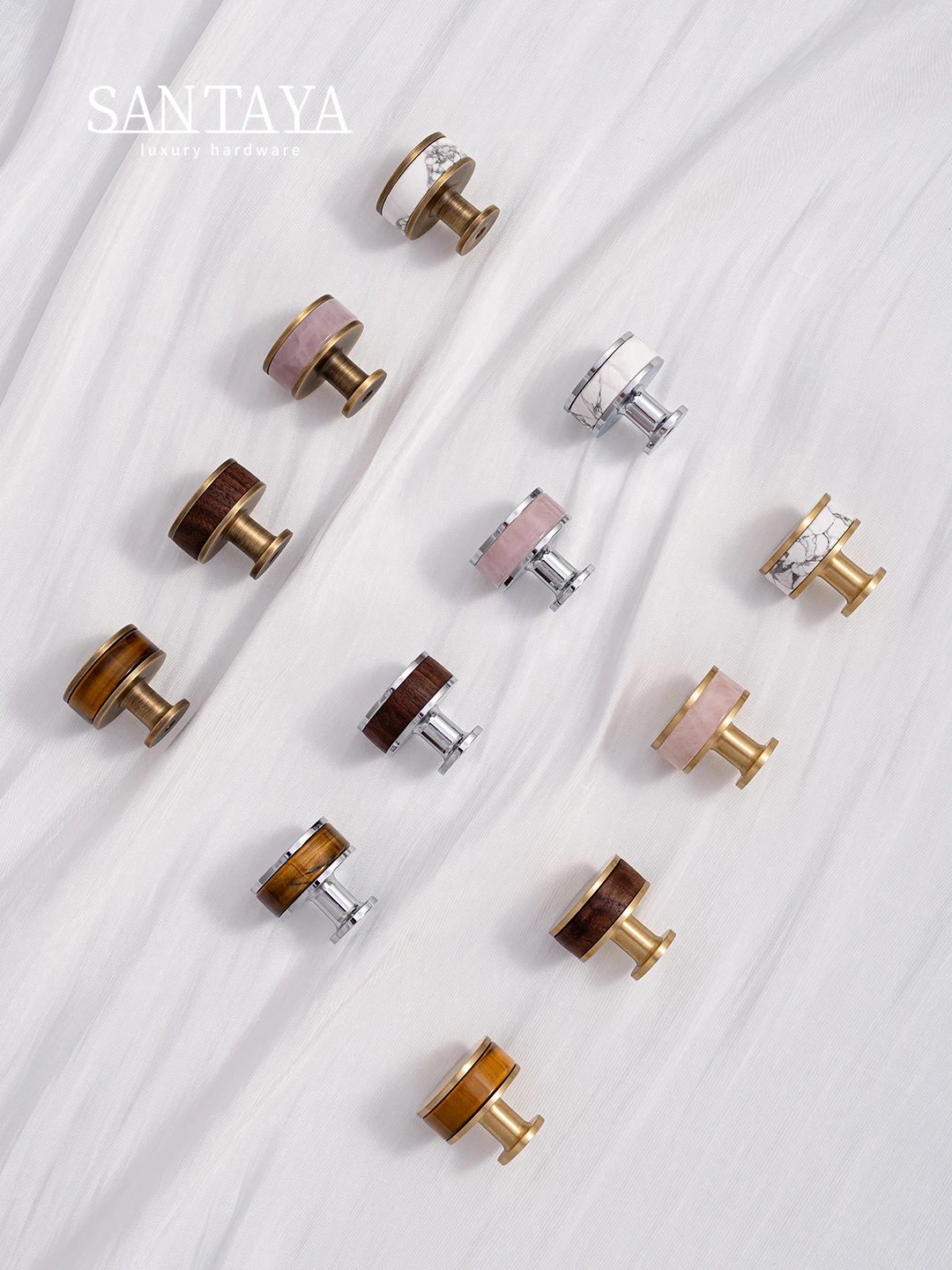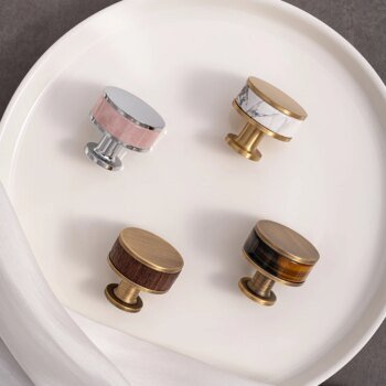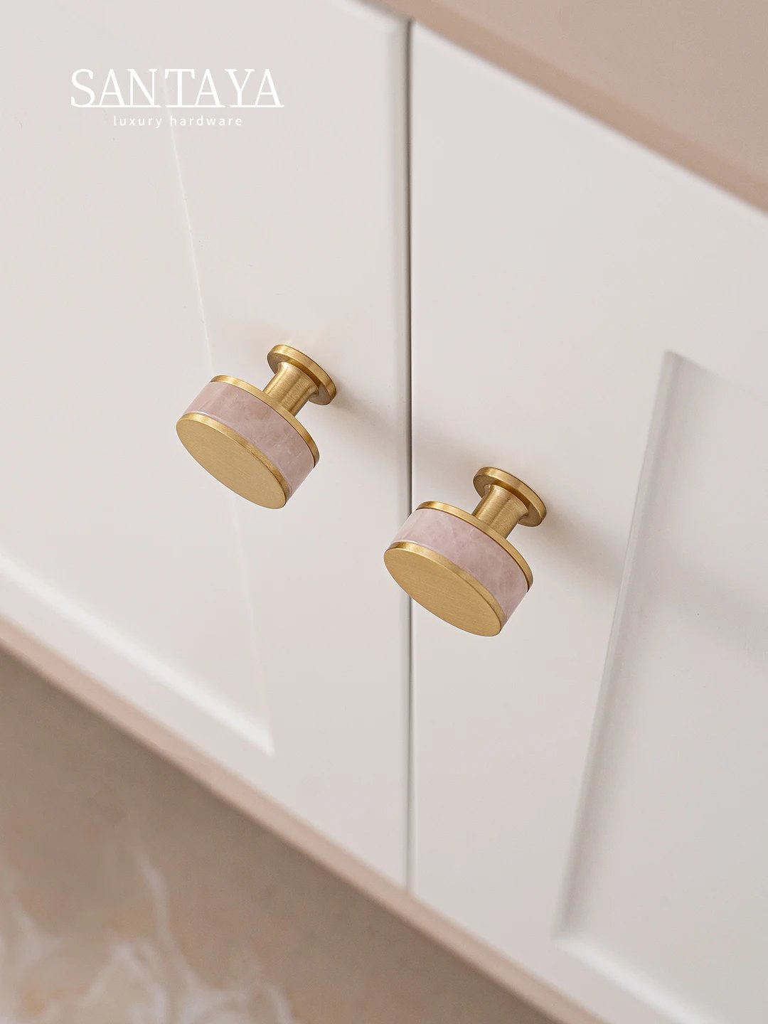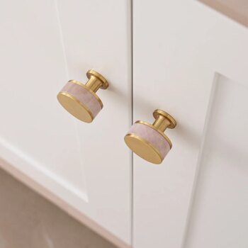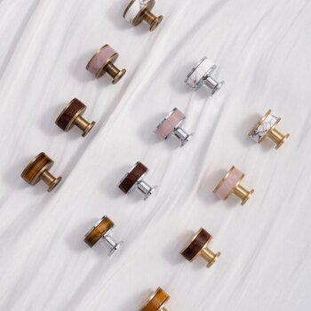 This cabinet knob is made from solid brass with a polished or brushed base, available in finishes such as antique brass, chrome and brushed brass. The top features natural stone or crystal-style elements in colours including pink, white, tigerās eye and walnut tones. Because natural materials are used, each knob has its own unique texture and pattern.