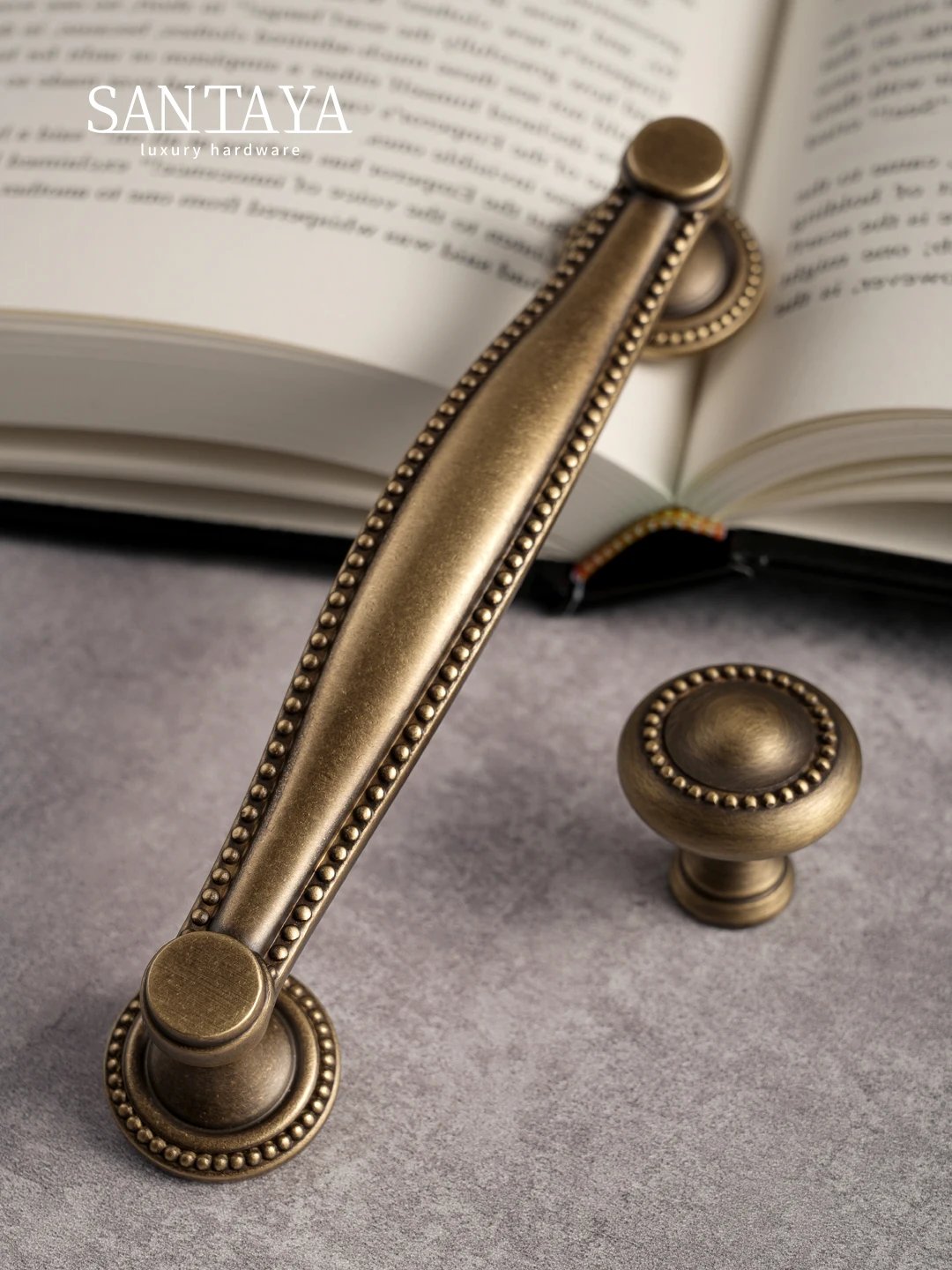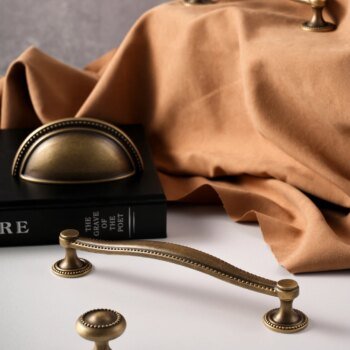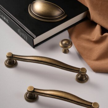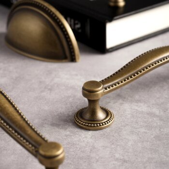 Solid brass cabinet handles and round drawer knobs in an antique brass finish, designed for kitchen cupboards, drawers and other furniture. The shell handle style gives a classic look that works well in both traditional and modern interiors.