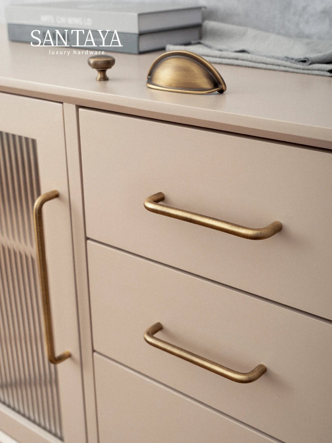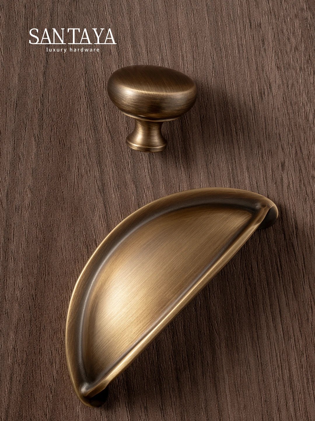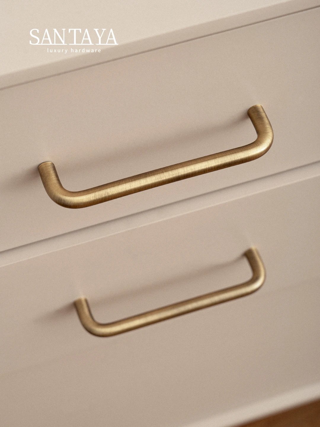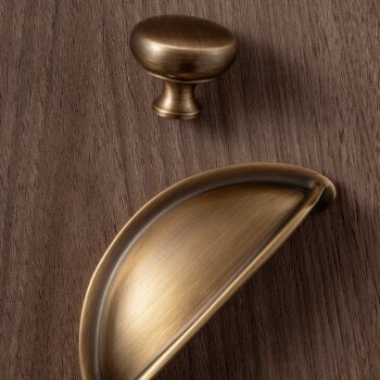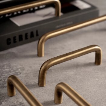 Solid brass U shaped cabinet handles and round drawer knobs in an antique brass finish, designed for kitchen cabinets, drawers, wardrobes and other furniture. The clean curved shape gives a simple modern look while keeping a classic brass feel.